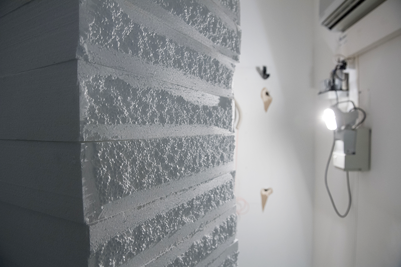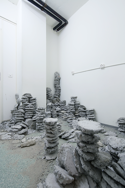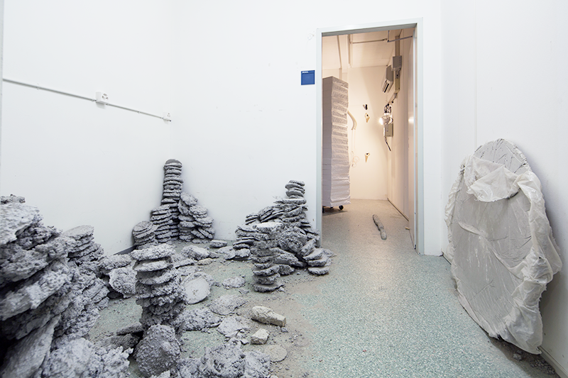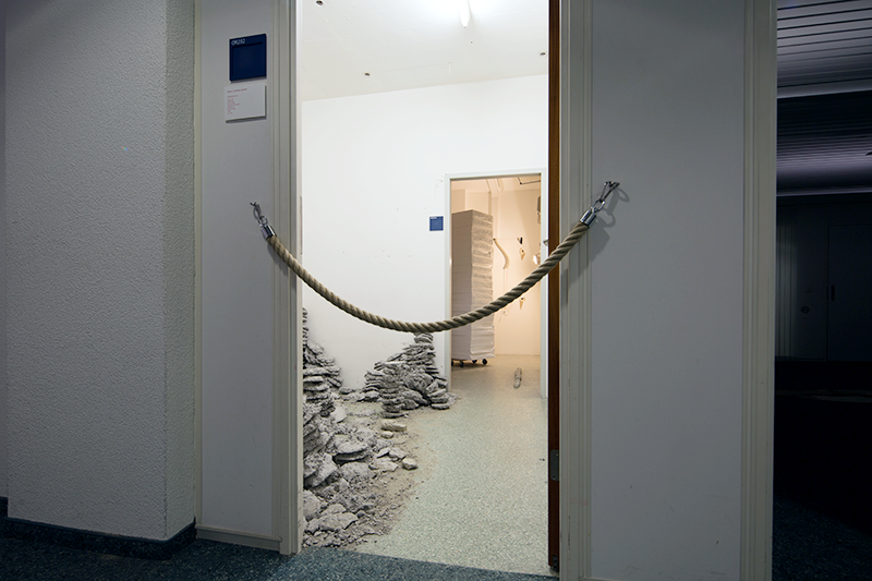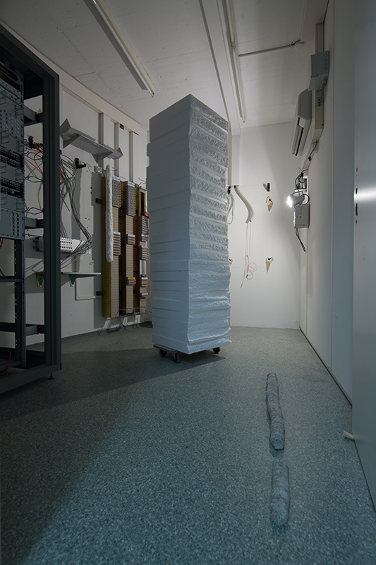 JUSTechnik No2 wird in einem Gebäude gezeigt, welches kurz vor seinem Abriss nochmals belebt wird. Die Kunst, die am und im sterbenden Bau präsentiert wird, wird mit dem Abbruch verschwinden. verschwindet mit dem Abbruch. Die Arbeit ist in zwei Räume aufgeteilt. Im vorderen Raum stapeln sich Türme von kleinen Betonscheiben, welche teils zusammengebrochen sind oder sehr fragil in- und durcheinander stehen. Die verwendete Menge an Beton definiert sich aus der maximalen Belastbarkeit des Bodens – 200 kg pro Quadratmeter. Dabei wurde ein durchschnittliches Gewicht der Besucher miteinberechnet und Raum für sie freigelassen. Die Scheiben sind so gross, wie sie Hände fassen können. Der zweite Teil der Arbeit befindet sich im hinteren Raum. Dieser war in der ursprünglichen Nutzung des Gebäudes ein Technikraum, wo alle Internetanschlüsse und Telefonleitungen zusammenkamen. Der Raum ist voll von technischen Geräten. Einige davon funktionierten noch und waren während der Zeit der Ausstellung in Betrieb. So wurde beispielsweise der Raum dauerhaft runtergekühlt und die Notstromleuchte lieferte das Lichf für den Ausstellungsraum.