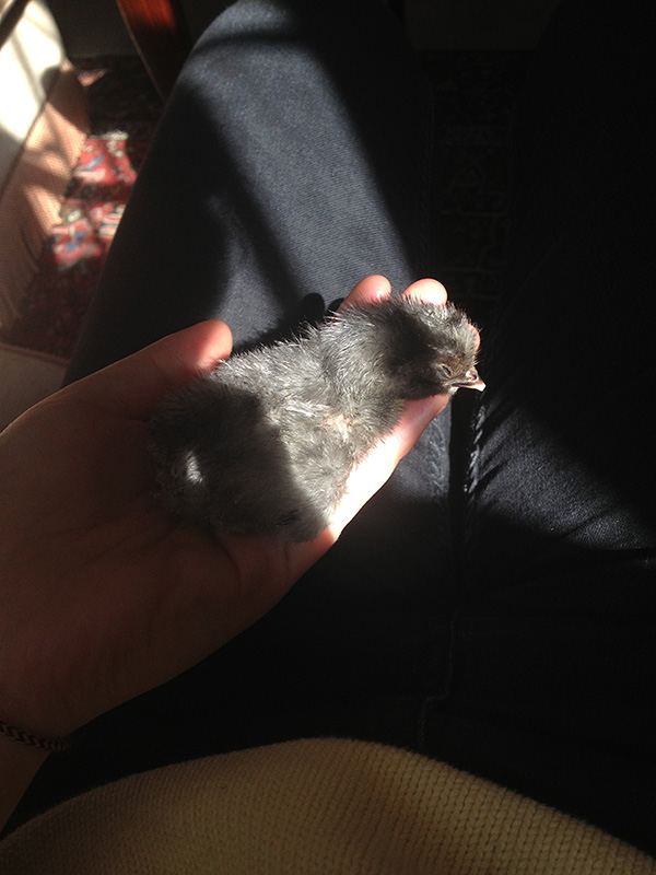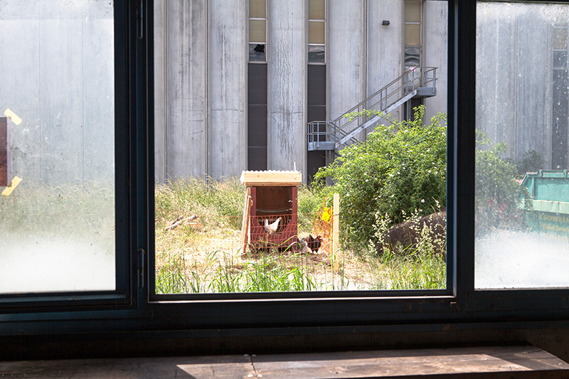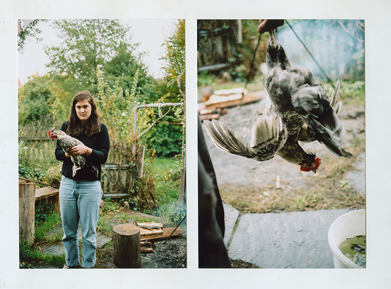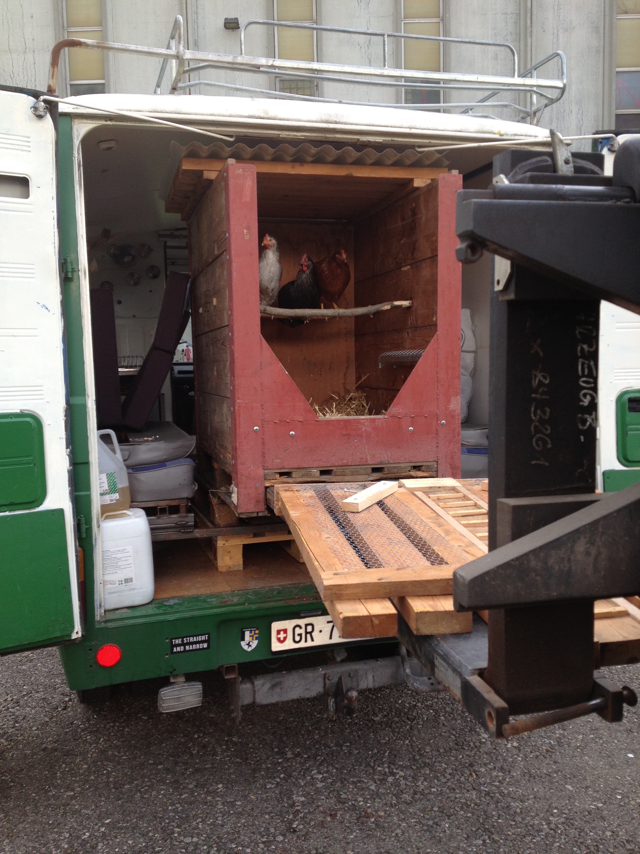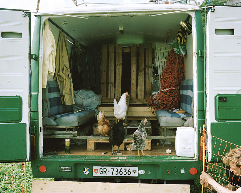 „Just making Chickens“ begann mit der Ausstellung, des Bachelor Studiengangs F otografie im Jahr 2013 in Leimbach. Während zwei Wochen zeigte ich dort vier Hühner die in einem selbstgebauten Stall wohnten. Fotografie entsteht mit Licht. Es wurden Spiegeleier mit Licht gebraten, Hühner mit Licht gezüchtet. Diese dann im Kontext der Fotografie ausgestellt. Nach der Ausstellung wurden die Hühner mitsamt Stall in einen Bus verladen und wir reisten für eine Woche ins Toggenburg. Dort zeigte ich eine Performance im Rahmen des Arthur Junior Festivals. Den ganzen Sommer über reiste ich mit den Hühnern. Die Arbeit endete erst, als ich alle Hühner untergebracht hatte und den Hahn selbst schlachten musste.