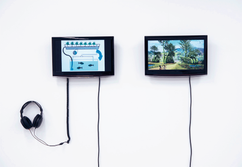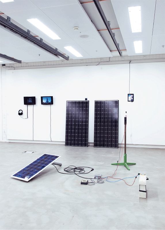 TURNUS besteht aus zwei Videos, eines zeigt animierte Lernvideos, Visualisierungen, darüber wie Erneuerbare Energien funktionieren und das andere, welche Welten daraus entstehen könnten. Utopiewelten von Architekten, Designern, Videogamern usw. Als Adiospur hört man den jeweiligen Orginalton des Videos. Das reicht in 40 Minuten von Erik Satie über Titelmusik von Mc Gyver bis hin zu den Anfängen der Technomusik aus den 90ern. Dazu sind Solarpanels wie Kunstwerke an der Wand platziert. Erweitert wird diese Installation durch ein funktionierendes System, das Kunstlicht aus dem Raum aufnimmt, diese Energie wird wiederum in Elektrizität umgewandelt und daraus entsteht erneut eine andere Energieform, nämlich Feuer (bzw. Zigarettenanzünder aus einem Fahrzeug). Man zündet sich mit dem im Raum vorhandenem Licht eine Zigarette an.